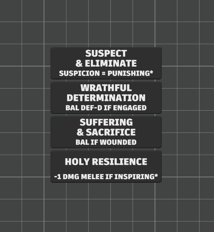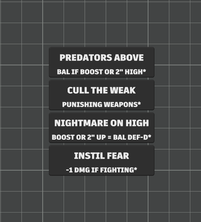 The Faction Strategy Ploy Tokens have been designed for use with the Kill Team 2024 (3rd Edition) Battle Box. These tokens are used to mark which Strategy Ploys you have active at each Turning Point, and can be slid into the dice tray back board for easy reference and visibility.