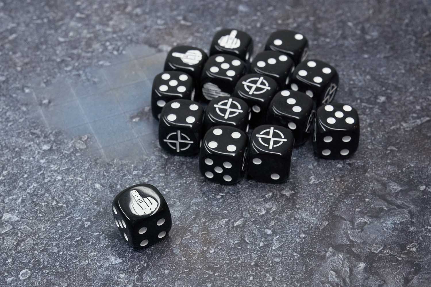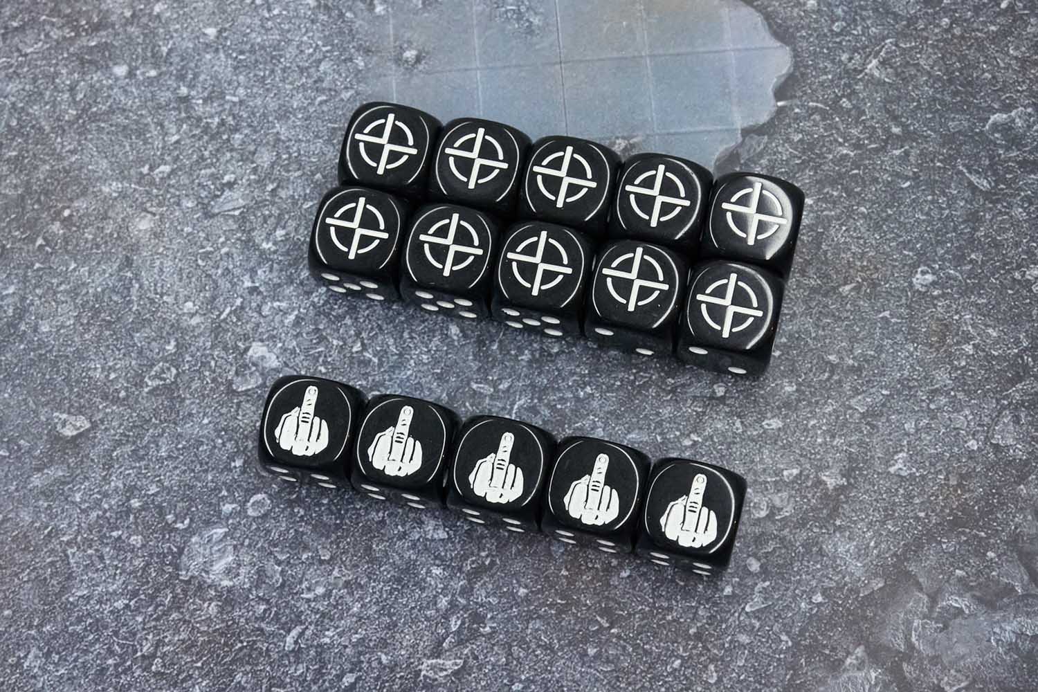 Having custom designs on 2 sides of the dice also means that, if you really hate your opponent, you can use the middle finger side as the 6, so every time you roll a crit, it's a big F@?# you to them! Just make sure to clarify which side is which at the start of the game.
