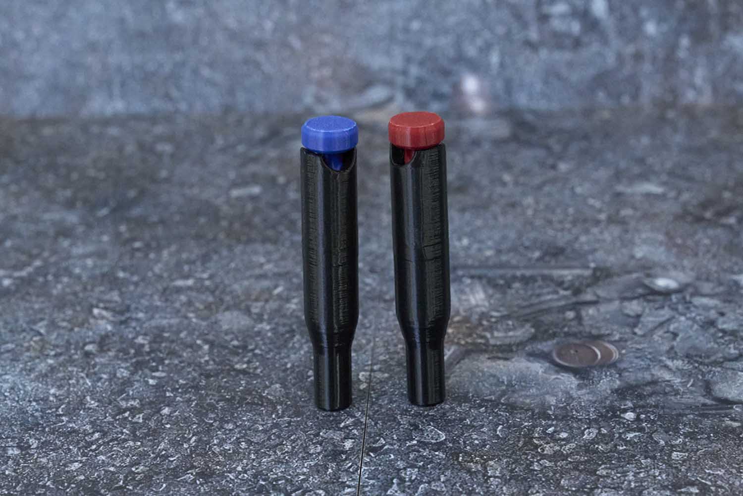 They consist of an outer black sheath with a coloured plunger, inserted with a magnet at the bottom of the plunger.